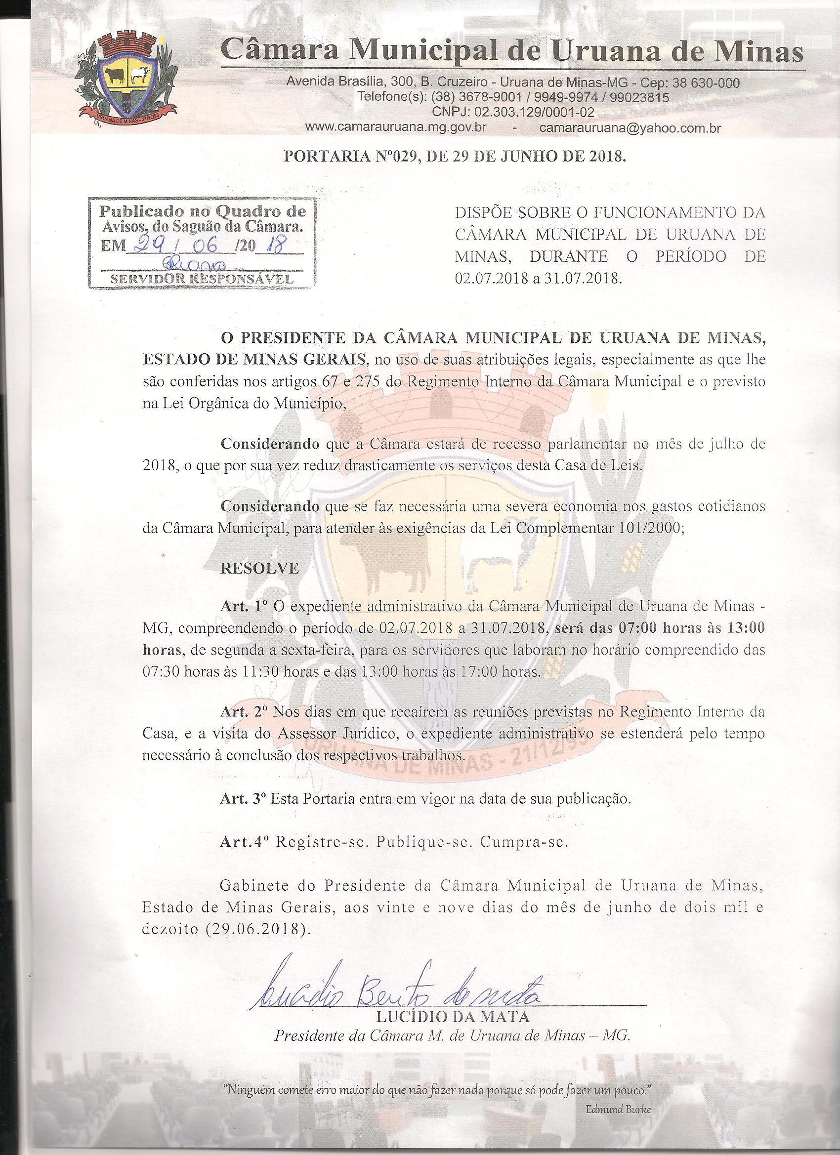 Ementa: DISPÕE SOBRE O FUNCIONAMENTO DA CÂMARA NO PERÍODO DE 02/07/2018 A 31/07/2018.