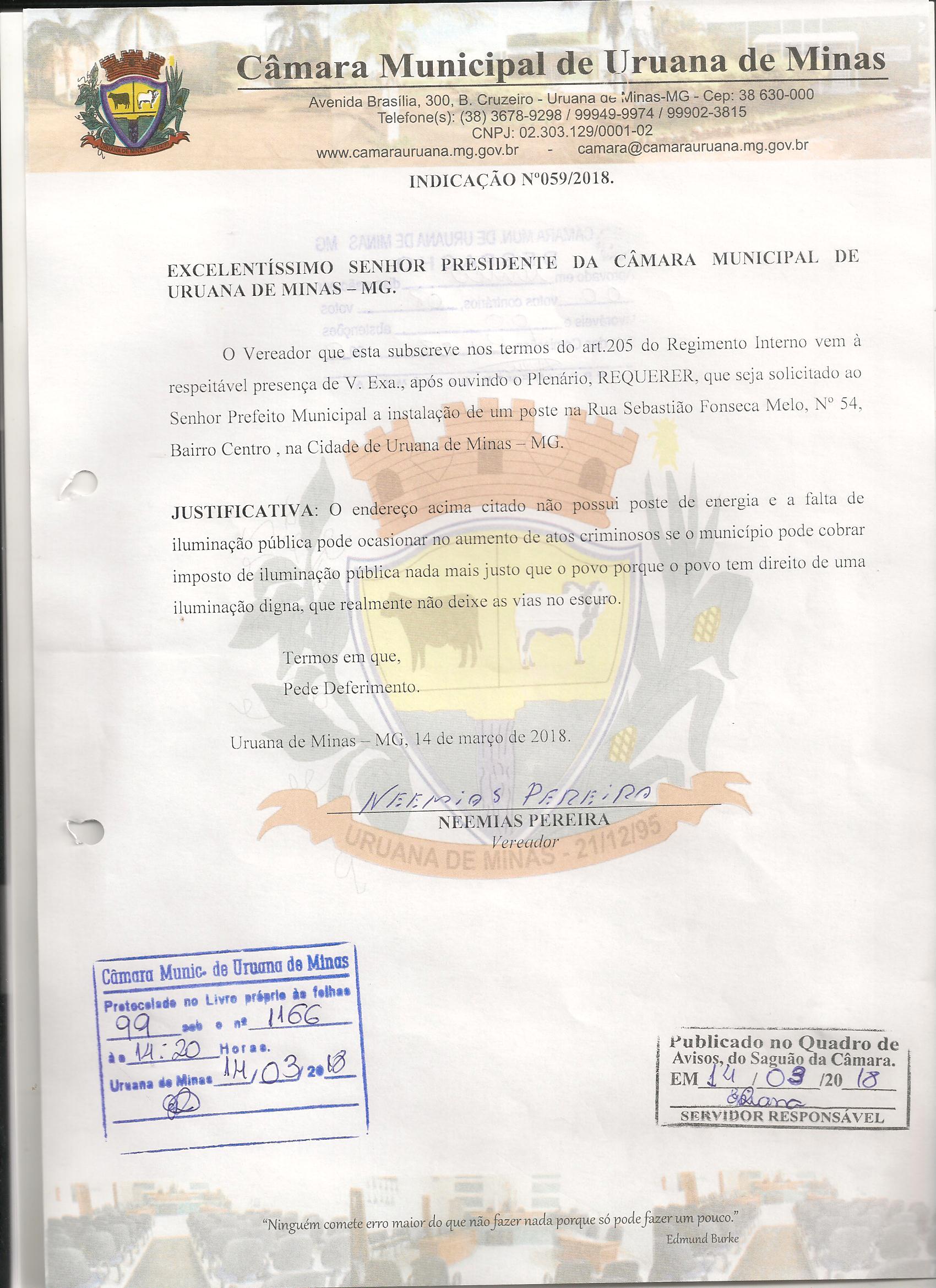 Ementa: REQUER QUE SEJA COLOCADO POSTE NA RUA SEBASTIÃO FONSECA DE MELO, Nº54 BAIRRO CENTRO.